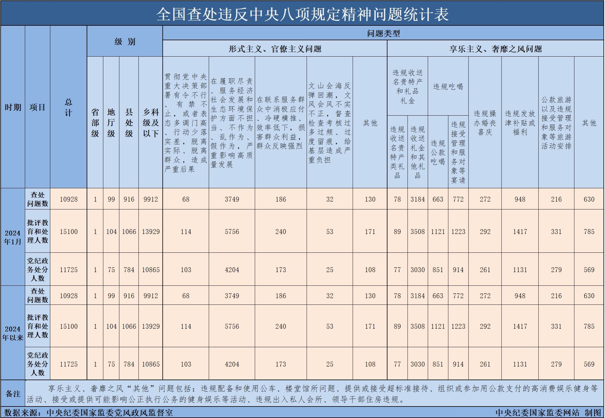 2月27日,中央纪委国家监委公布了2024年1月全国查处违反中央八项规定精神问题汇总情况。当月,全国共查处违反中央八项规定精神问题10928起,批评教育和处理15100人,其中党纪政务处分11725人,这是连续第125个月公布月报数据。