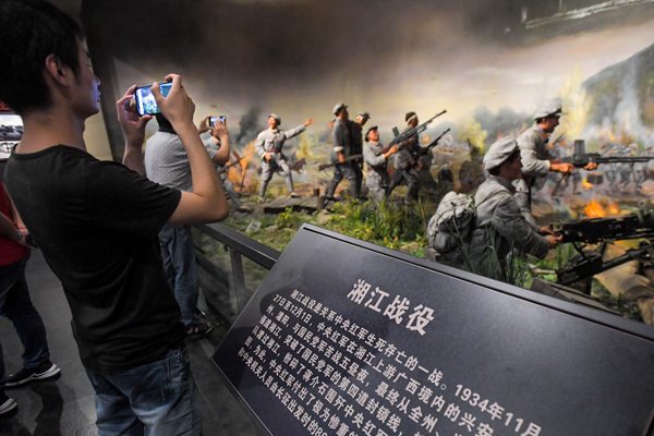 参观者在湖南通道侗族自治县通道转兵纪念馆内参观“湘江战役”场景。陈泽国 摄